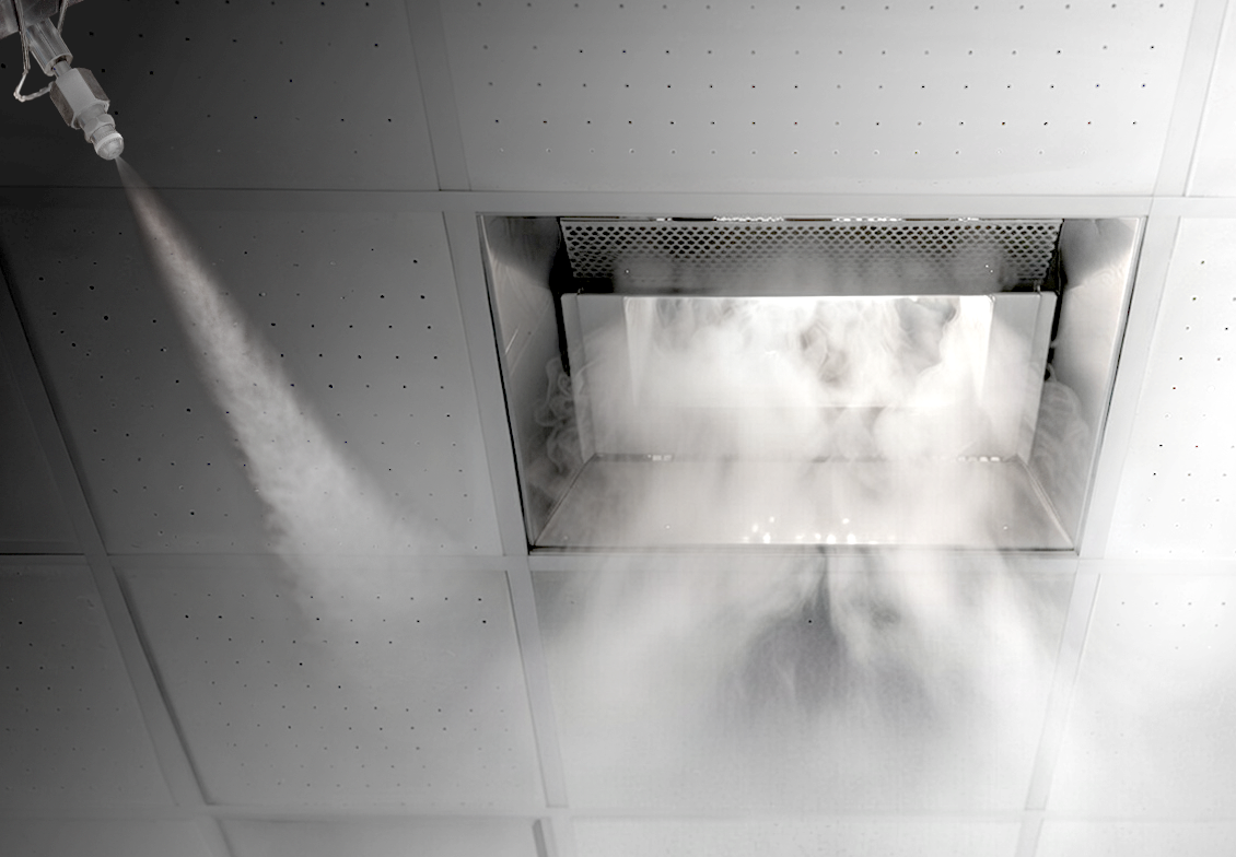 Temperatur och luftfuktighet styrs normalt via ventilations- och luftbehandlingsaggregat (AHU) med integrerad befuktning, som tillför jämnt konditionerad luft direkt till sprutboxar och alla tillhörande zoner.